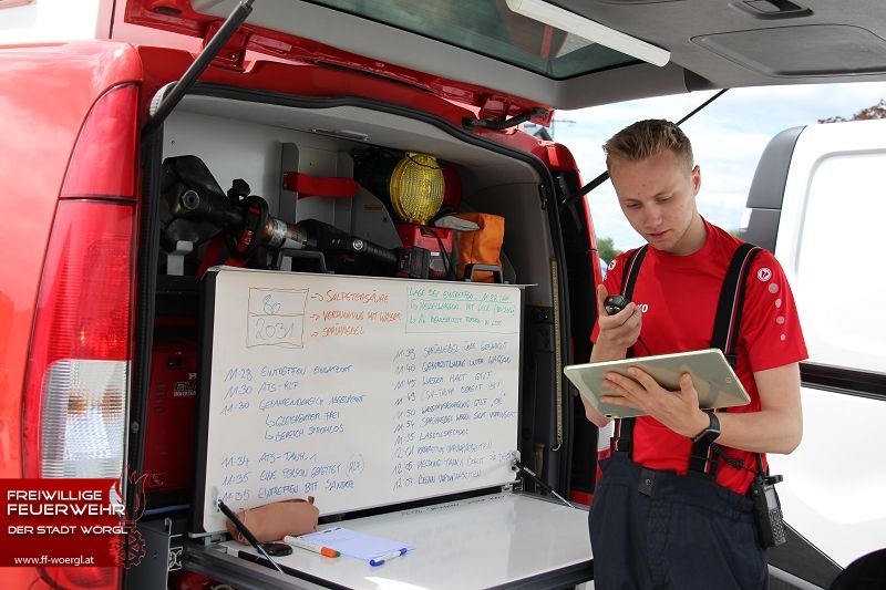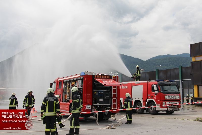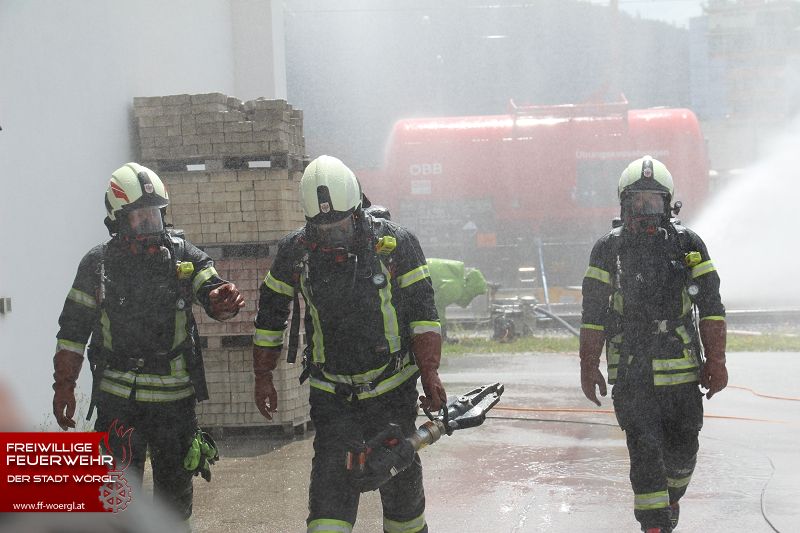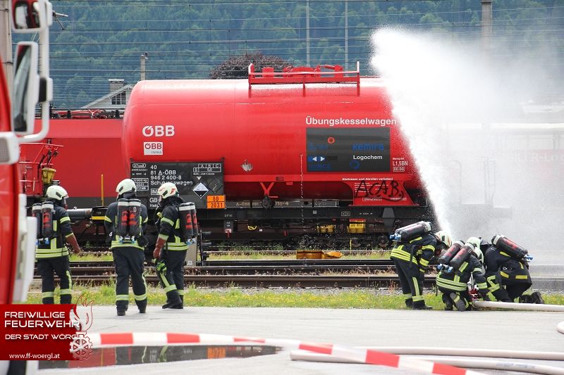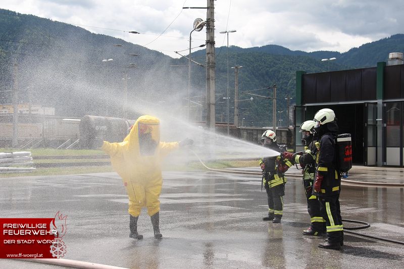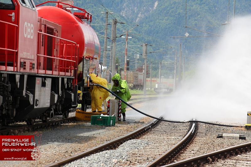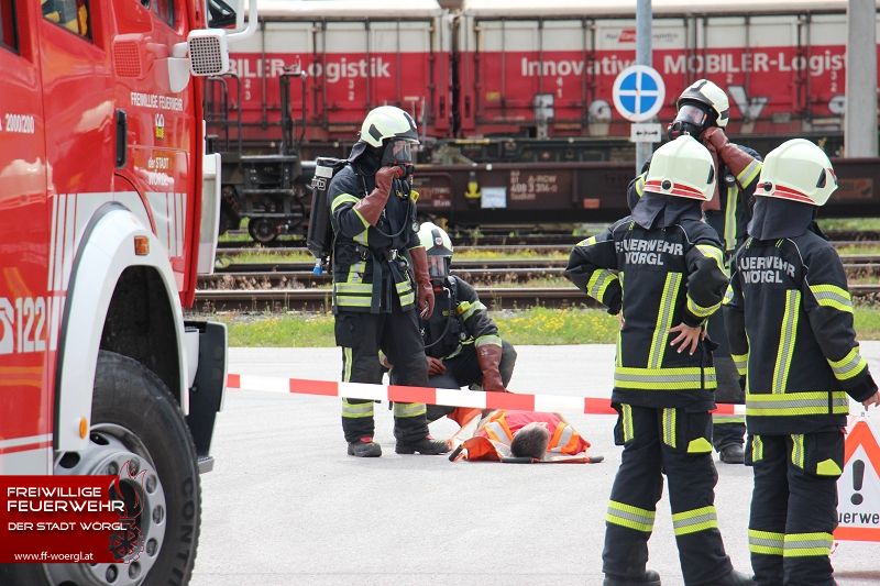 Die Stadtfeuerwehr Wörgl wurde kurz nach 11 Uhr zum Übungsort alarmiert. Dort trat aus einem Kesselwaggon ätzende Salpetersäure aus. Umgehend wurde die BTF Sandoz Kundl zur Unterstützung hinzugezogen. Währenddessen erkundete der erste Atemschutztrupp die Lage. Dabei wurde eine bewusstlose Person in der Lok lokalisiert. Umgehend wurde diese Person aus dem Gefahrenbereich gerettet und dekontaminiert. Die bereits eingetroffene Betriebsfeuerwehr mit ihren Sonderfahrzeugen rüstete umgehend einen Trupp mit Chemischenschutzanzügen aus. Dieser konnte schließlich das Leck im Kesselwaggon abdichten bzw. die Säure umpumpen. Parallel dazu wurde auch mittels Werfer ein Sprühnebel über den Gefahrenbereich gezogen.